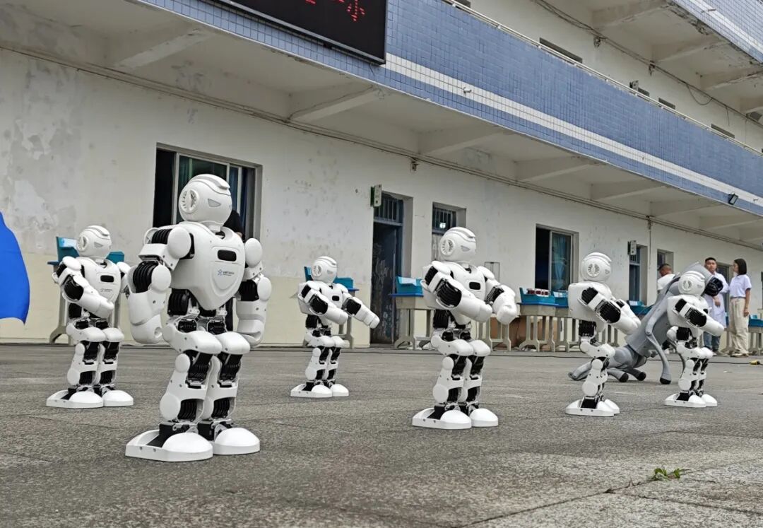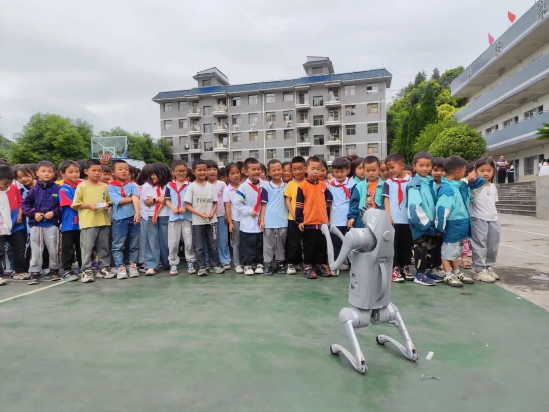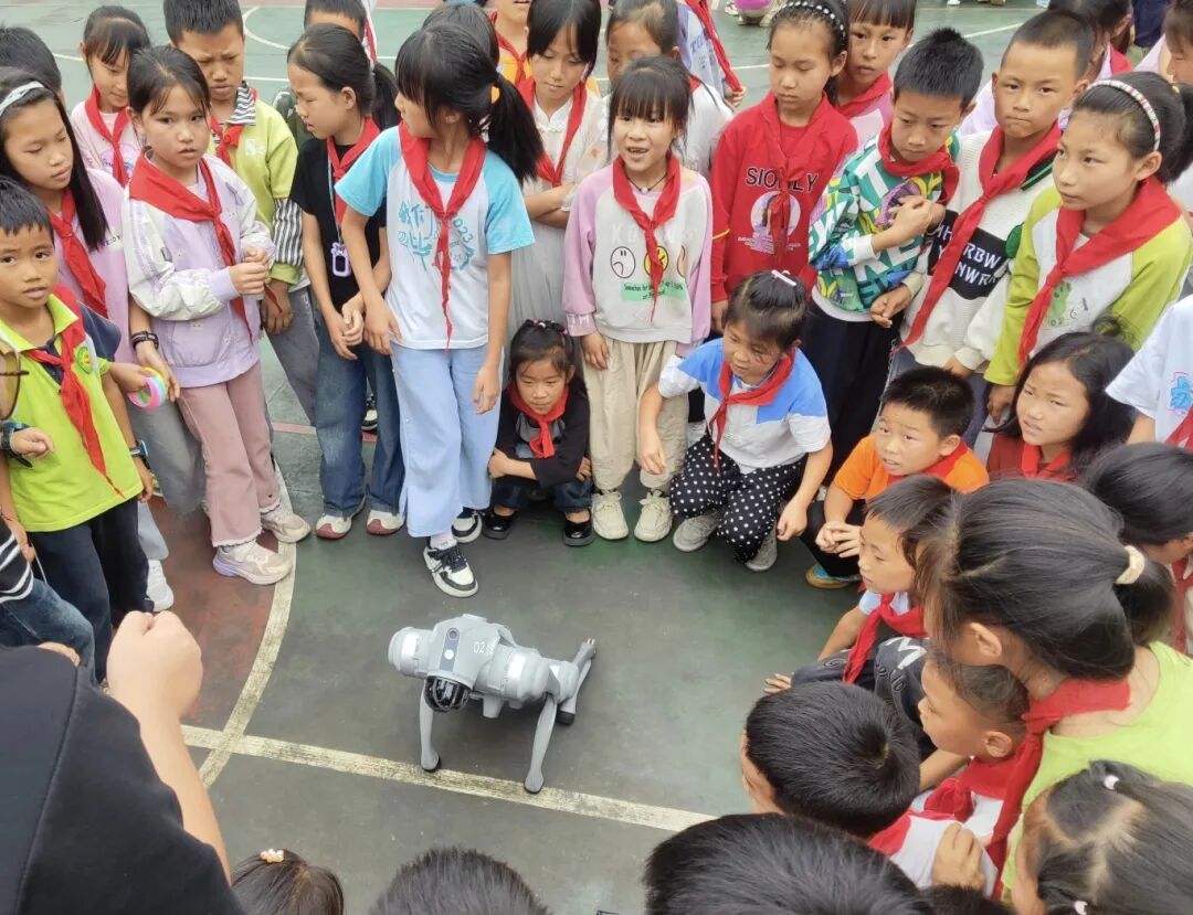 在三合一小,机器人和机器狗表演,瞬间点燃现场气氛,随着指令下达,机器人灵动起舞、翻转腾挪,机器狗模仿动物姿态,时而奔跑时而跳跃。