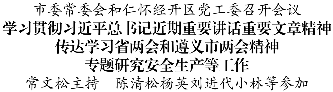 2月10日,市委常委会和仁怀经开区党工委召开会议,学习贯彻习近平总书记近期重要讲话重要文章精神,传达学习省两会和遵义市两会精神,研究贯彻落实意见,专题研究安全生产等工作。