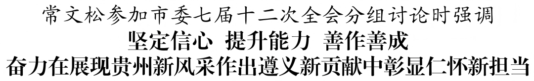 12月19日,市委书记常文松参加市委七届十二次全会分组讨论。他强调,要深入学习贯彻党的二十届四中全会精神,全面落实省委十三届八次全会和遵义市委六届十二次全会部署,聚焦高质量发展首要任务,坚定信心、提升能力、善作善成,在省、遵义市发展大局中主动担当、积极作为,奋力推动高质量发展和现代化建设不断取得新突破、迈上新台阶。