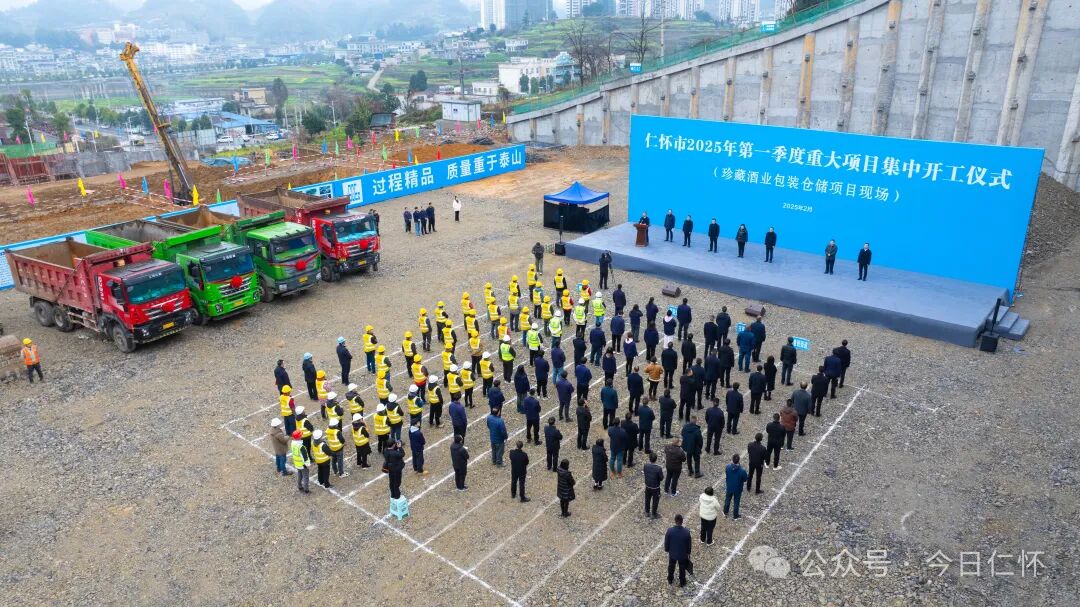 今年2月,仁怀市2025年一季度项目集中开工仪式在鲁班街道尚礼社区珍藏酒业有限公司包装仓储项目现场举行。机器轰鸣、热火朝天的建设场景全面铺开,吹响了全年110个项目建设冲锋号角。其中,一季度计划新开工项目30个,总投资35.3亿元,涵盖“四化”项目11个、基础设施项目14个、民生工程项目5个。