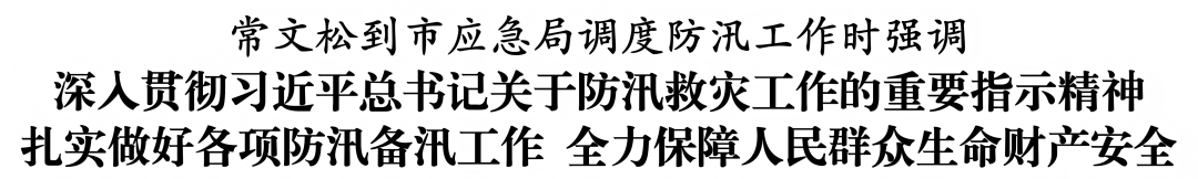 7月8日晚,市委书记常文松到市应急局调度全市防汛工作。他强调,要深入贯彻习近平总书记关于防汛救灾工作的重要指示精神,牢固树立人民至上、生命至上理念,以高度的责任感和使命感,扎实做好各项防汛备汛工作,全力保障人民群众生命财产安全。市领导罗小松、欧大兵、郑莹参加。