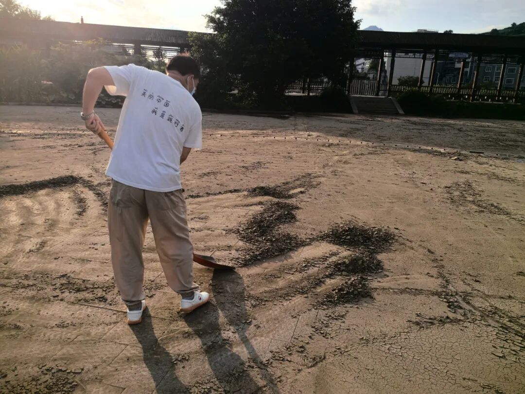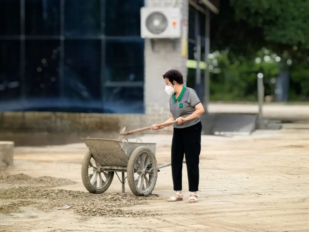 广场上,有的淤泥还未彻底干结,还是泥水的膏状物体清理难度大,铁锨、推车、扫帚齐上阵。