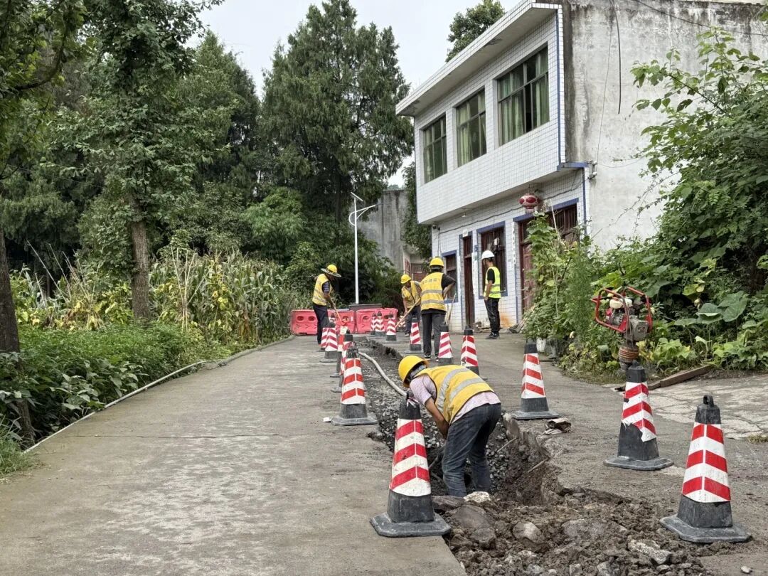 在高大坪镇农村规模化供水工程,施工现场,挖掘机轰鸣声不断,工人正在有序开展沟槽开挖,填埋输水管道,道路恢复等作业。