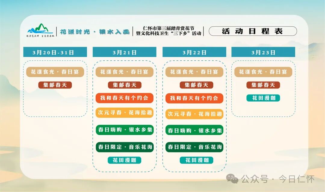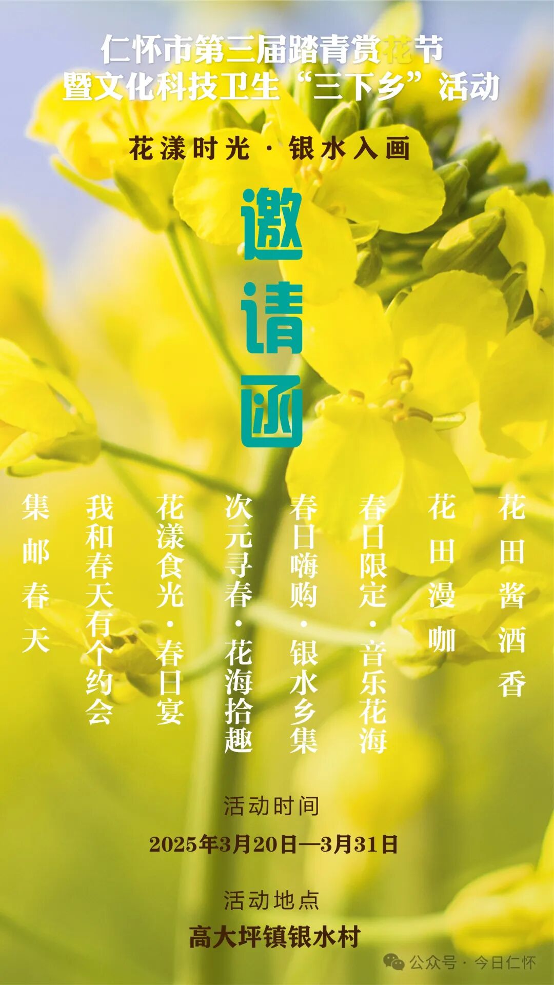 春有信,花有约,3月20日至3月31日仁怀市第三届踏青赏花节,向您发出邀请,欢迎来到这场以“花漾时光·银水入画”为主题踏青赏花活动。