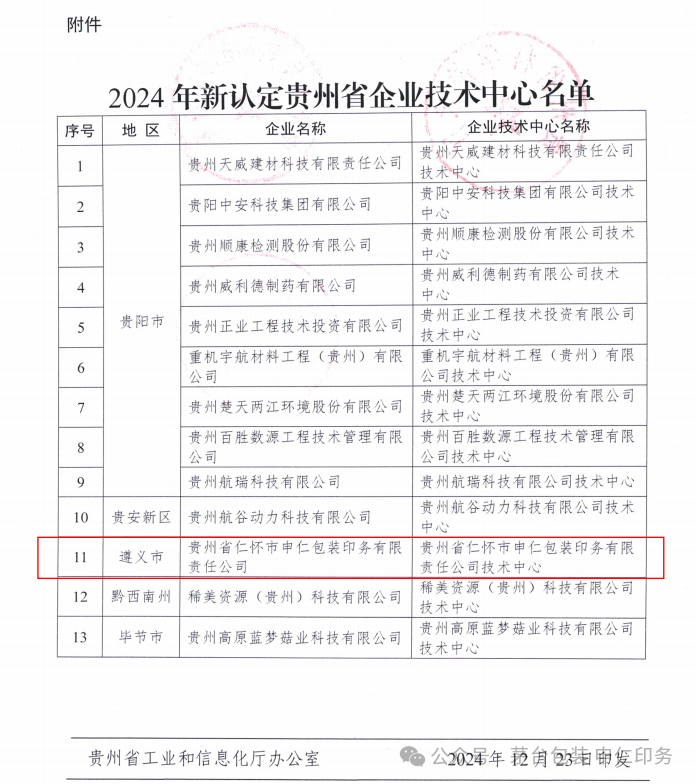 近日,贵州省工业和信息化厅公布了《2024年新认定贵州省企业技术中心名单》,其中申仁公司成功认定,“贵州省仁怀市申仁包装印务有限责任公司技术中心”成为遵义地区该年度唯一入选企业。